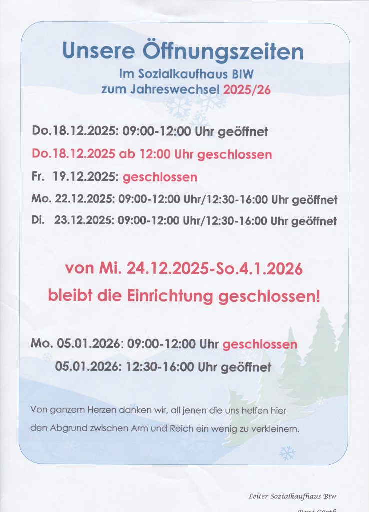 Im August 2014 haben wir eine Außenstelle für sozialbedürftige Bürger mit eingeschränkter Mobilität eingerichtet, um auch ihnen die Möglichkeit zu geben Kleinteile oder Textilien zu erwerben.